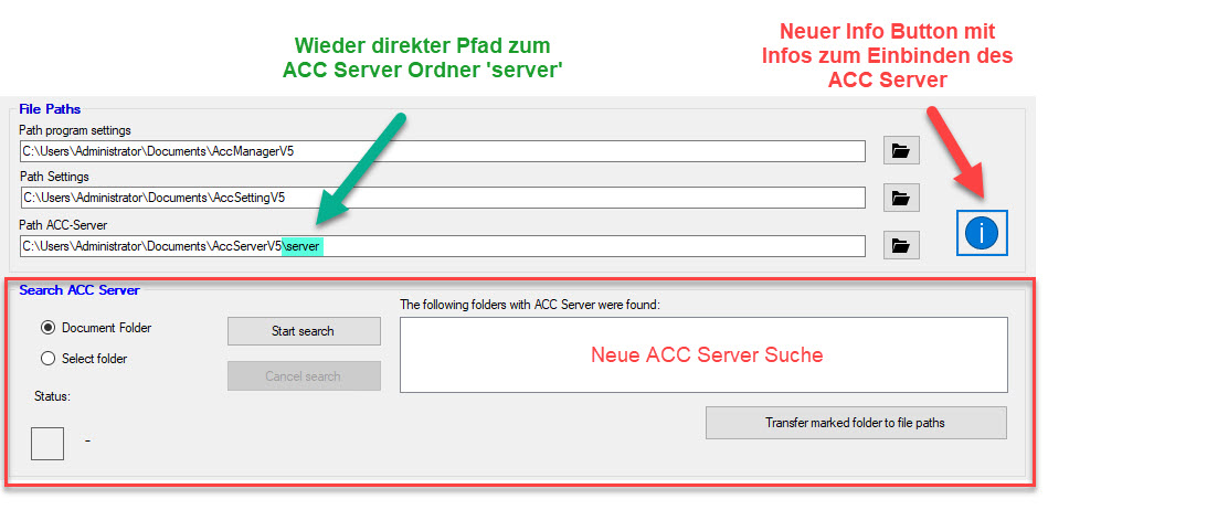 - FIX – Optionen – Rücksetzen des Standardordners behoben. Jetzt ist ein eigener Ordner für den ACC-Server wieder wählbar.